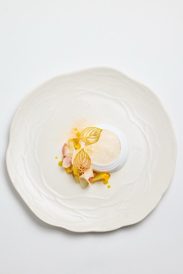 Le curcuma, confit et glacé, vient relever l’assiette avec douceur, tandis que la vanille, utilisée en émulsion, apporte rondeur et gourmandise. L’ensemble donne un dessert précis, équilibré et contemporain, où chaque ingrédient trouve naturellement sa place.