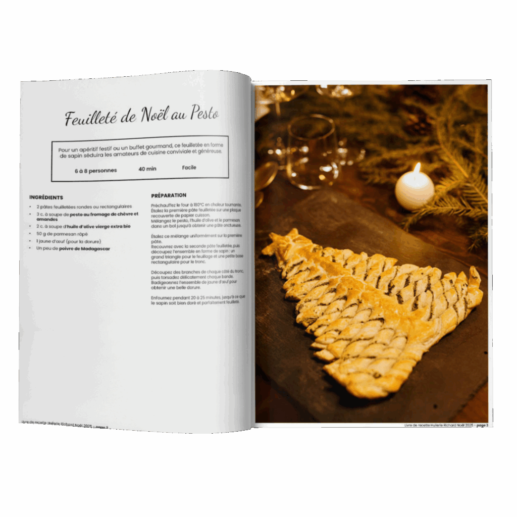Régalez-vous avec les propositions culinaires suivantes : Feuilleté de Noël au pesto, Roses de saumon gravlax à l’huile d’olive au citron, Gratin de Saint-Jacques & poisson blanc, Poulet rôti au citron, romarin et huile d’olive, Sablés de Noël aux oranges confites et Bûche aux agrumes et pistache.
