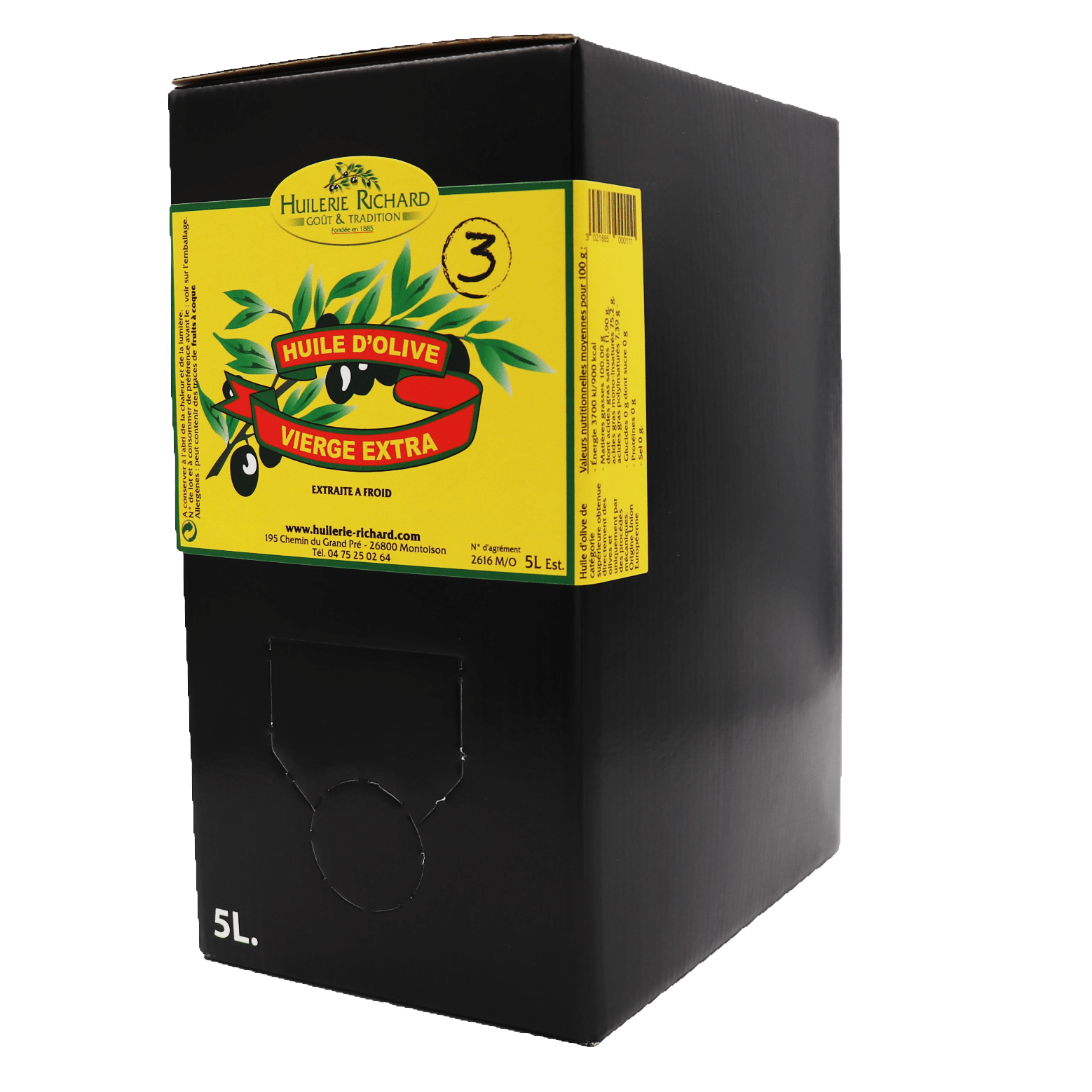 Grâce au savoir-faire séculaire de la famille Richard, cette huile d’olive 5L N°3 en BIB est le fruit d’un assemblage patient et rigoureux d’olives sélectionnées du bassin méditerranéen.