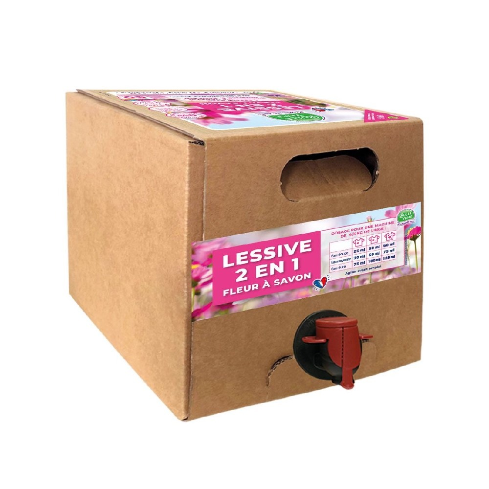 Lessive fleur à savon liquide 100% naturelle avec adoucissant végétal incorporé. La gamme Bulle Verte propose des produits écologiques et économiques.