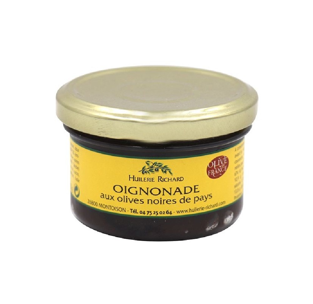 Préparation culinaire à base d’oignons doux des Cévennes AOP émincés (55%) et de la pulpe d’olives noires de nyons AOP (31%).