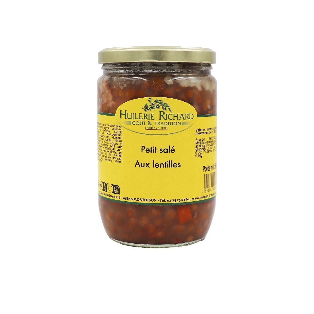 Plongez dans les saveurs authentiques du terroir français avec ce Petit Salé aux Lentilles préparé par Huilerie Richard, artisan de goût depuis 1885. Ce plat cuisiné à l’ancienne marie la tendreté du petit salé à la finesse des lentilles vertes précuites, mijotés dans un jus de cuisson savoureux et riche en légumes. Un repas complet, généreux et prêt à déguster, idéal pour une pause gourmande et réconfortante.