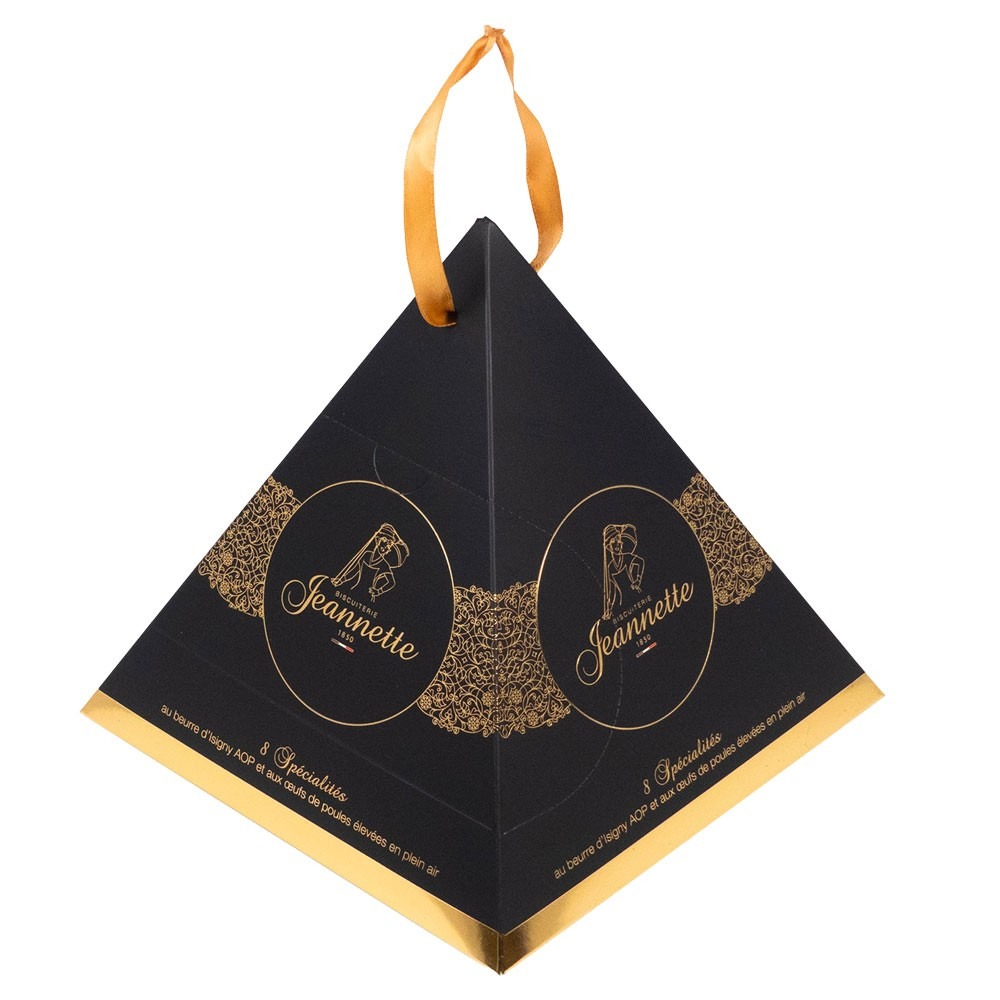 La Pyramide Noire réunit tout le savoir-faire pâtissier normand à travers un assortiment de 8 madeleines artisanales Jeannette, moelleuses, dorées et délicatement parfumées. Fabriquées en Normandie, elles incarnent la tradition et la qualité d’une maison historique, fondée sur la passion du goût et le respect des ingrédients. Chaque pyramide se compose de quatre saveurs emblématiques : deux madeleines au chocolat à la texture riche et cacaotée, deux à la framboise au parfum fruité et acidulé, deux au citron à la fraîcheur vive et équilibrée, et deux à la saveur amande, subtile et raffinée.